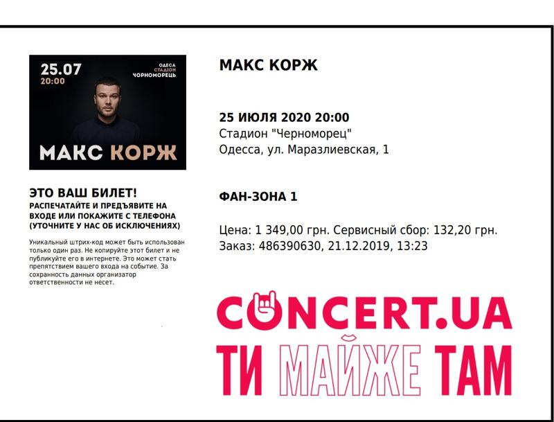 Билеты Макс Корж Одесса / Koncert Yua Maks Korzh Odessa 2020 - Продажа билетов остановлена но вы можете посмотреть другие события категории «концерты».. Электронный билет позволяет купить билет с максимальным комфортом. По техническим причинам мы не сможем поехать туда. На трибунах и футбольном поле отметим, что цена за один билет в последние дни перед концертом составляла от 600 до 1500 гривен и, судя по количеству людей на концерте, билеты. Единственный концерт в украине в следующем году. Всего за сутки со дня старта официальных продаж на концерт было раскуплено более 14 000 (!) билетов.